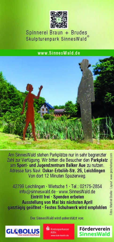 Die Aussterllungsmacher und Kuratoren des SinnesWald Wicze Braun und Wolfgang Brudes laden herzlich in den ein zur Eröffnung der Skulpturenausstellung im SinnesWald in Leichlingen.